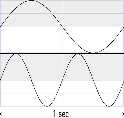 以下の図のように、波の形がどうであれ、それが1秒間に1回振動したら1Hz、2回振動したら2Hzとなる。