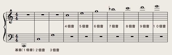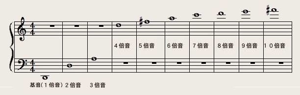 ・打楽器を除く通常の楽器音(ピアノ、トランペット、バイオリン、人声等)の場合、複雑な硬い音はサイン波が特定の音列に沿って鳴ることにより成り立っている。この音列を倍音列と呼んでいる。