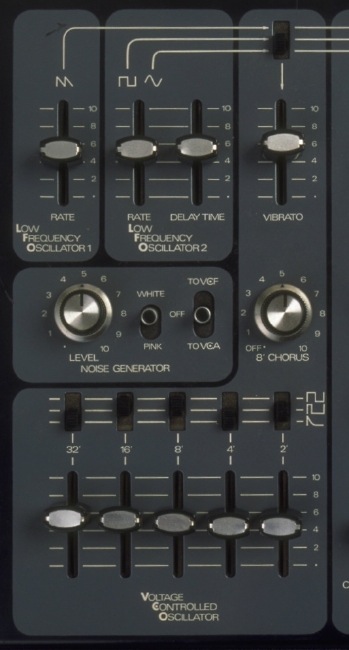 このシンセの VCO は 32', 16', 8', 4', 2' の各音域のスライダーを持ち、各々の音域の波形を矩形波、パルス波、鋸歯状波から選べる。更に 8' には CHORUS 効果のボリュームが付いている。コーラス効果は早さ固定で深さだけを調整できる。複数の音域をミックスできるが、1つの VCO を分周しているだけなので、分厚い音になるわけではない。