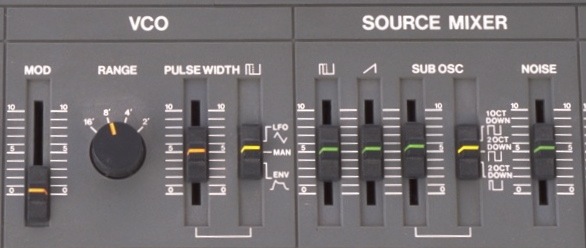 波形のセレクトは VCO 側ではなく、右隣にある SOURCE MIXER で行う。ここではパルス波、鋸歯状波のレベルの他に、SUB OSC、NOISE のレベルが調整できる。