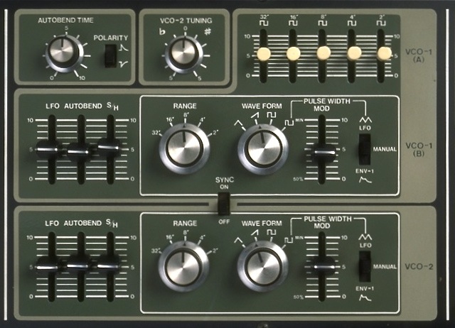 上部中央に VCO 2 のチューニングをはさんで、左上に AUTOBEND TIME と、POLARITY という謎の機能が付いている。AUTOBEND は鍵盤を押すたびにピッチを下または上からベンドする機能で、ポリフォニックシンセのブラス音ではよく使われる方法ではあるが、モノフォニック(デュオフォニック)のシンセにわざわざ付けるようなもん?と結構疑問である。私なら 32' 〜 2' のフェーダーと AUTOBEND を取っ払って VCO 用のエンベロープジェネレーターを付けますけどね。