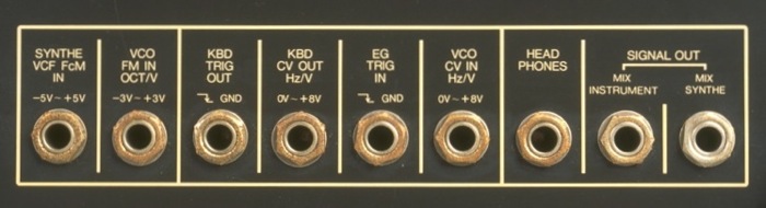最後に Korg のシンセ、Σ(シグマ)の背面のインターフェイス部分を紹介しておこう。このシンセでは Oct/V と Hz/V の端子が混在している。また VCF、VCO のコントロール CV の幅がまちまちで、使っていると混乱する。恐らく、時期的に Oct/V が一般的になり始めたが、以前の Korg の製品の方式も踏襲するための苦肉の策では?と思われる。