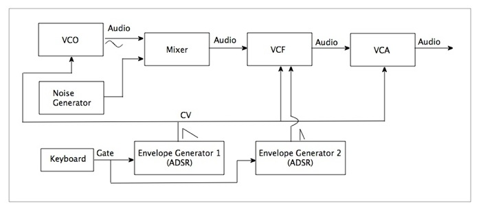 という順番で大体の音を作り、VCF の CutOff の状態や、Amount の調整を行ったり、Envelope Generator の Decay Time、Release Time を調整したりしています。