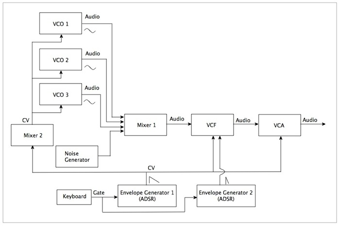 ・方法は、タム1で説明したセットの VCO の数を増やすという事で、ブロックダイアグラムで示すと以下のようになります。