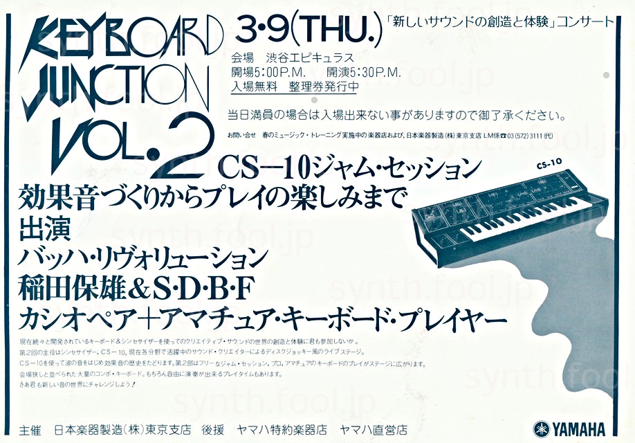 キーボード・ジャンクションVol.2(1977年):ヤマハ主催のイベント。元ボーリング場の渋谷エピキュラスはスタジオ/ホール/ラウンジを備えテレビ中継も可能。出演のバッハリボリューションはフランスの音楽祭で受賞したシンセグループ、稲田保雄はアルバム感覚思考が出た頃、カシオペアはすでにフュージョンファンの間では有名
