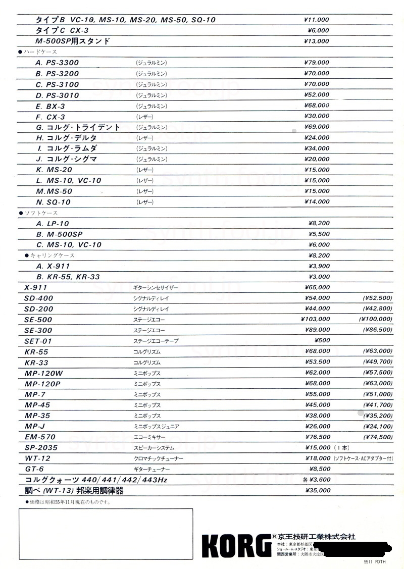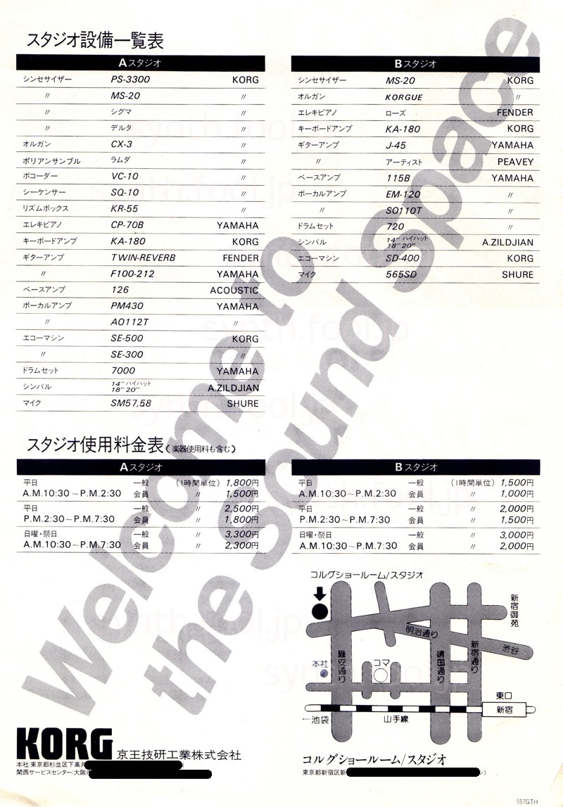 Korg Studio 案内(1980 年)A: 新大久保にあった Korg のスタジオパンフレット。同じ場所にショールーム、シンセサイザースクールも併設していた。