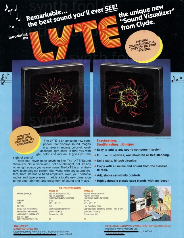 Lyte(1985 年頃?):ステレオの近くに置くと、音に反応して LED の模様が出るという商品。写真を見ると LED が回転してるようにも見えるんだけど、果たしてどのくらい売れたのか?