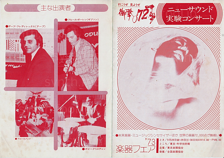 楽器フェア総合パンフレット(1973年)A:1973年の楽器フェアパンフレット。ローランドは SH-1000 を、Korg は Minikorg 700 を、Hillwood はブルーコメッツ '73 と、日本で開発されたシンセサイザーが初めて公開された記念すべき楽器フェアでした。
