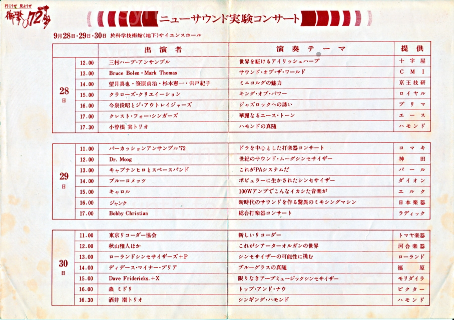 楽器フェア総合パンフレット(1973年)B:タイムスケジュールを見ると分かるように、当時の日本ではまだ PA システムすら知られていないような状況でした。また、Moog からは Dr.Moog が、Arp からは Dave Fridericks が直々にデモを行いに来たのも貴重でした。