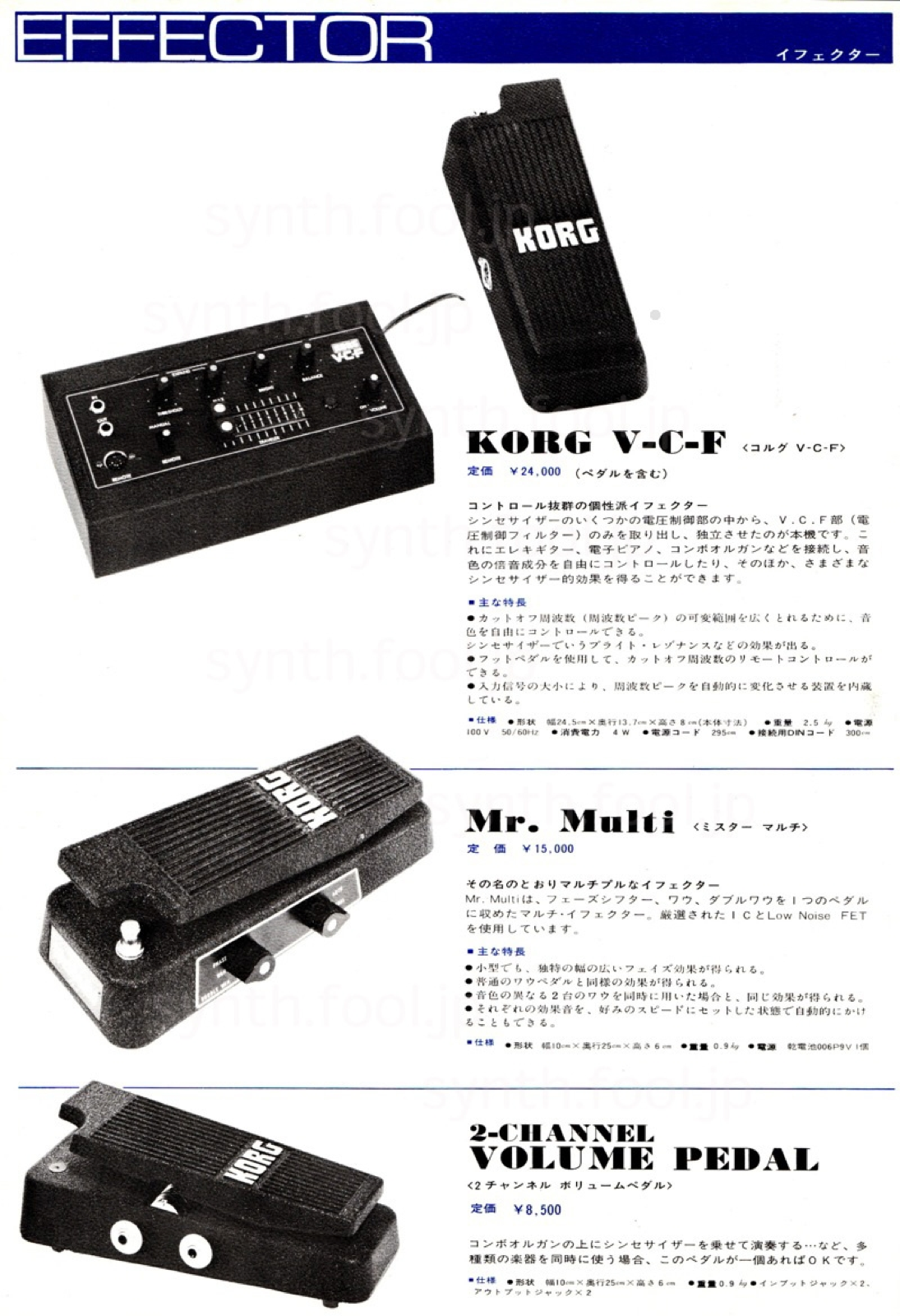 Korg 総合パンフレット (1975 年) H:ワウやフェイザーのペダル。中々斬新な設計でした。
