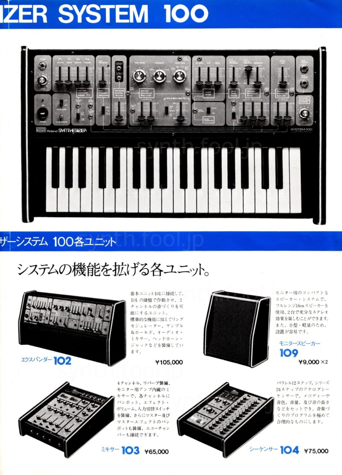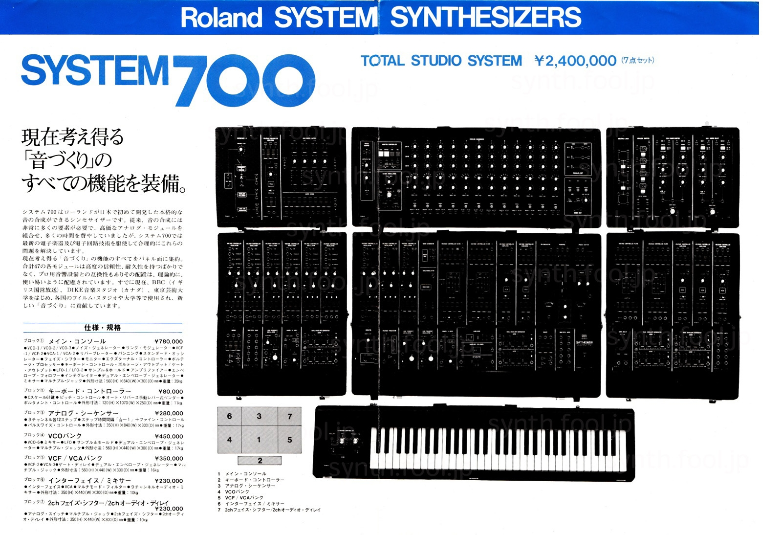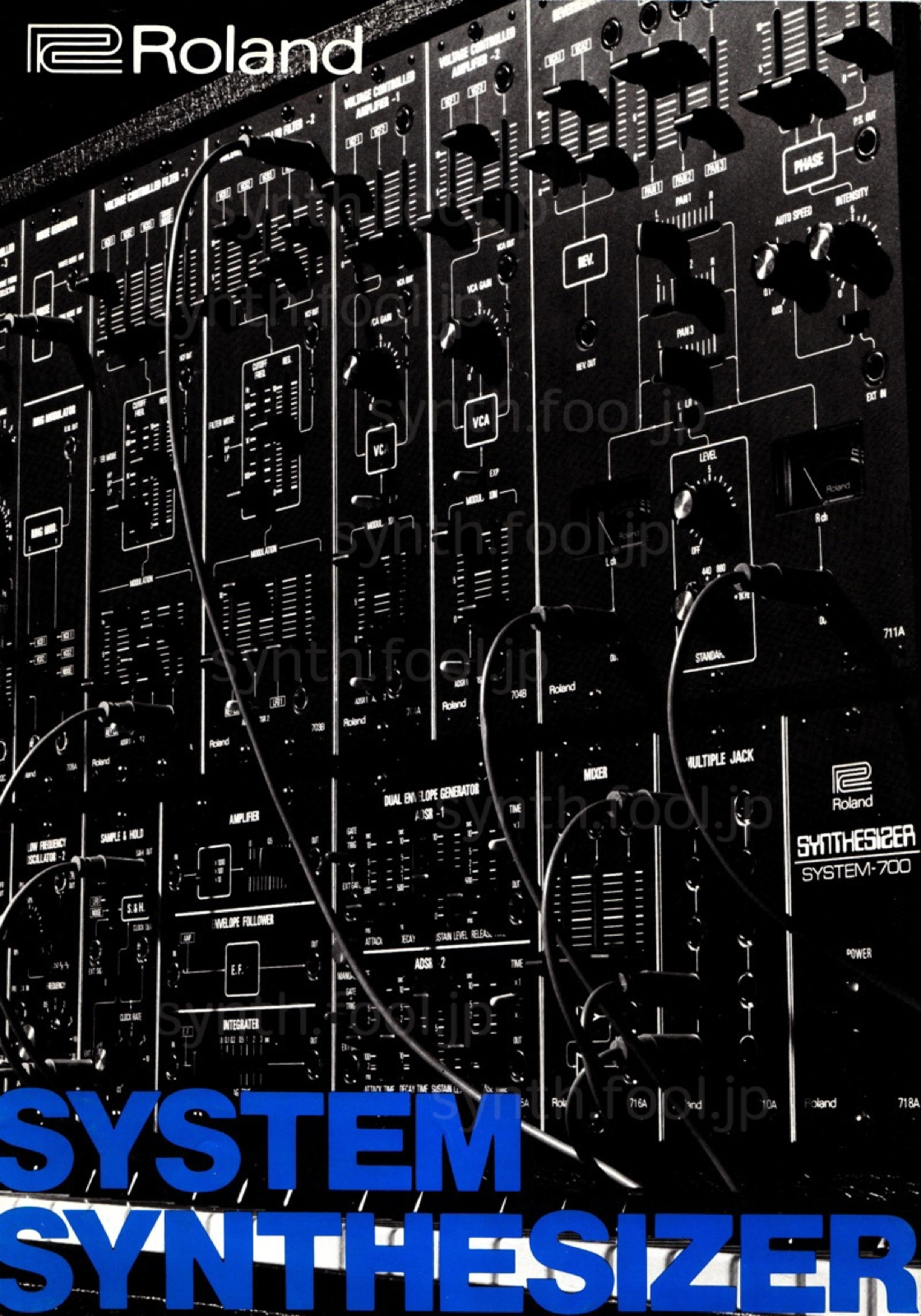 Roland モジュラー(1976 年)A:ローランドが System-700 を発売した直後のシンセサイザー総合パンフレット。まだ SH-1000 も現役で紙面に載っています。