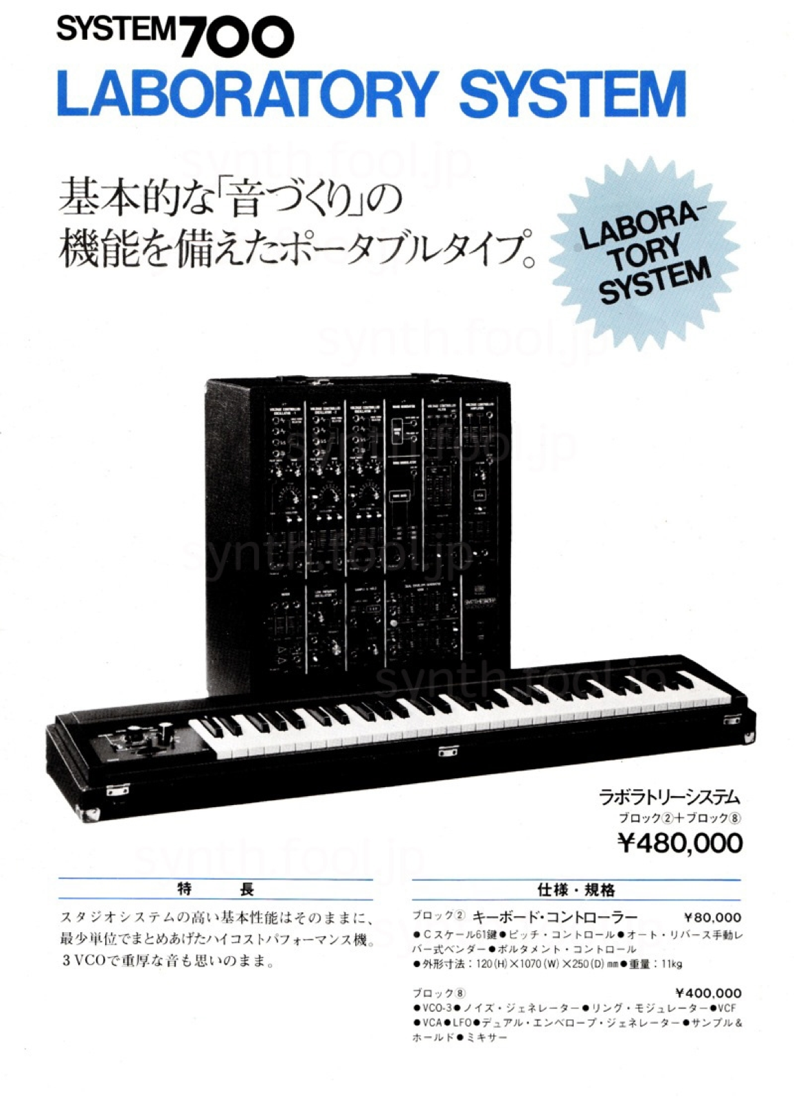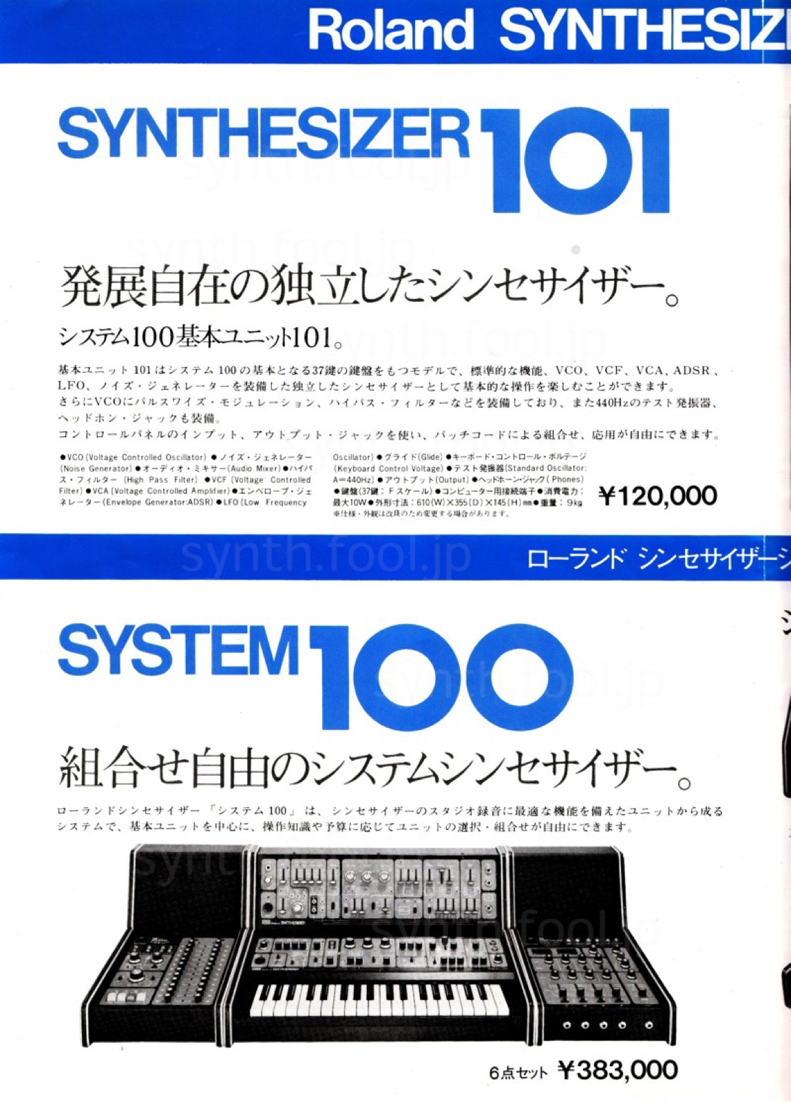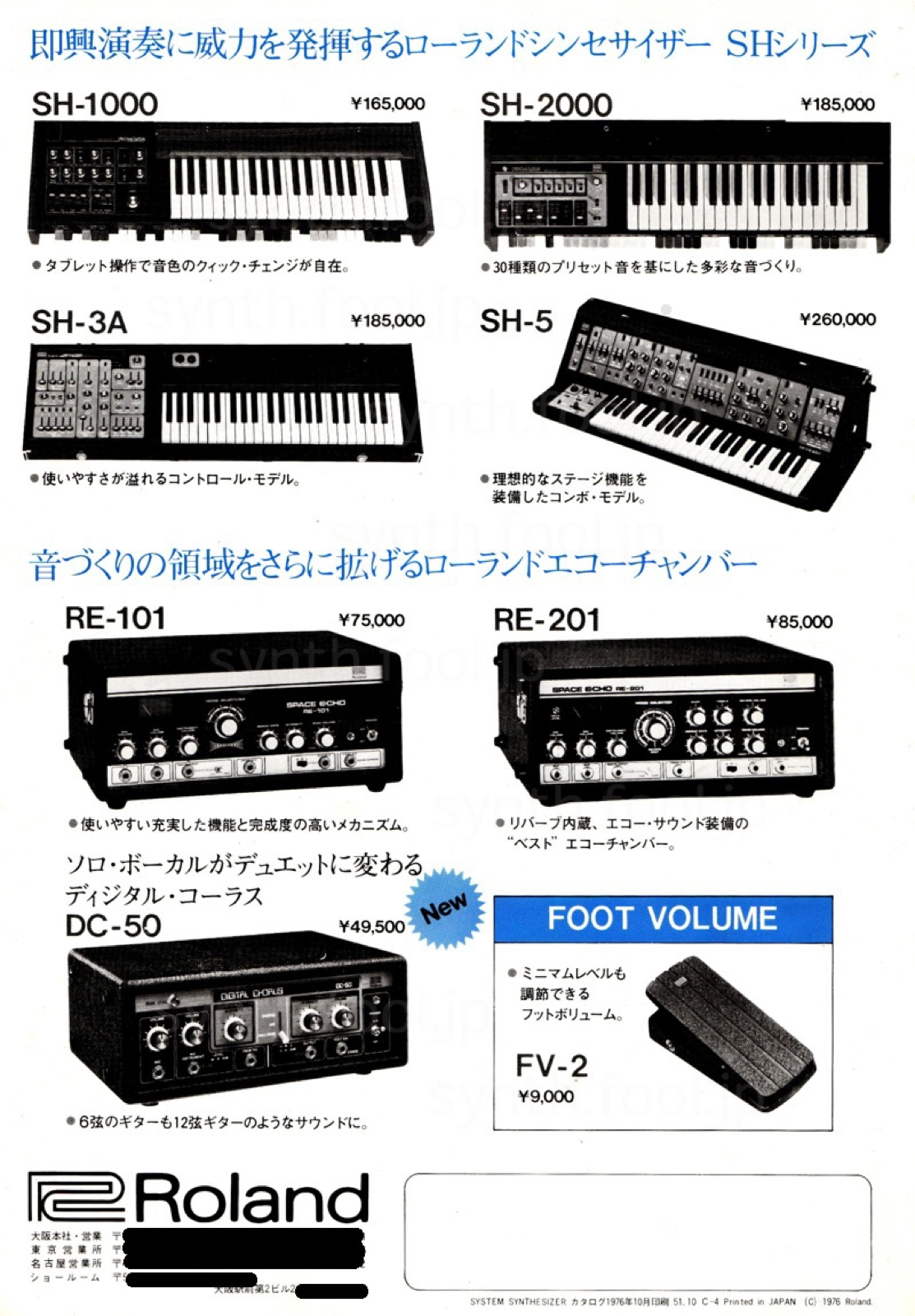 Roland モジュラー(1976 年)A:ローランドが System-700 を発売した直後のシンセサイザー総合パンフレット。まだ SH-1000 も現役で紙面に載っています。